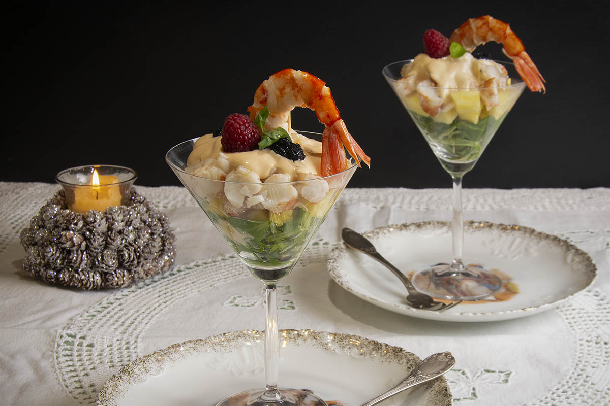 • Coloca una primera capa de canónigos (o lechuga cortada en juliana), a continuación un poquito de salsa rosa, sigue colocando la piña, las gambas/langostinos 2 cucharadas colmadas (mejor ser generoso) de salsa rosa, decora con las huevas de lumpo, la frambuesa y una gamba/langostino.